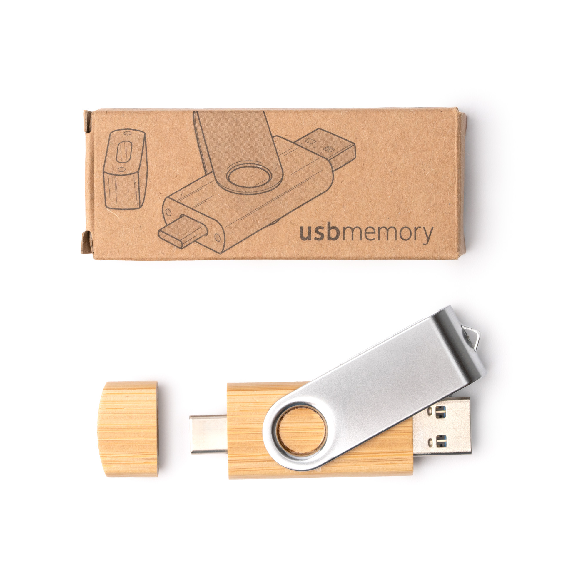 Memoria USB 3.0 con capacidad de 32GB. Elaborado en cuerpo de bambú y un clip metálico giratorio. Ofrece entrada y salida Tipo C y USB.