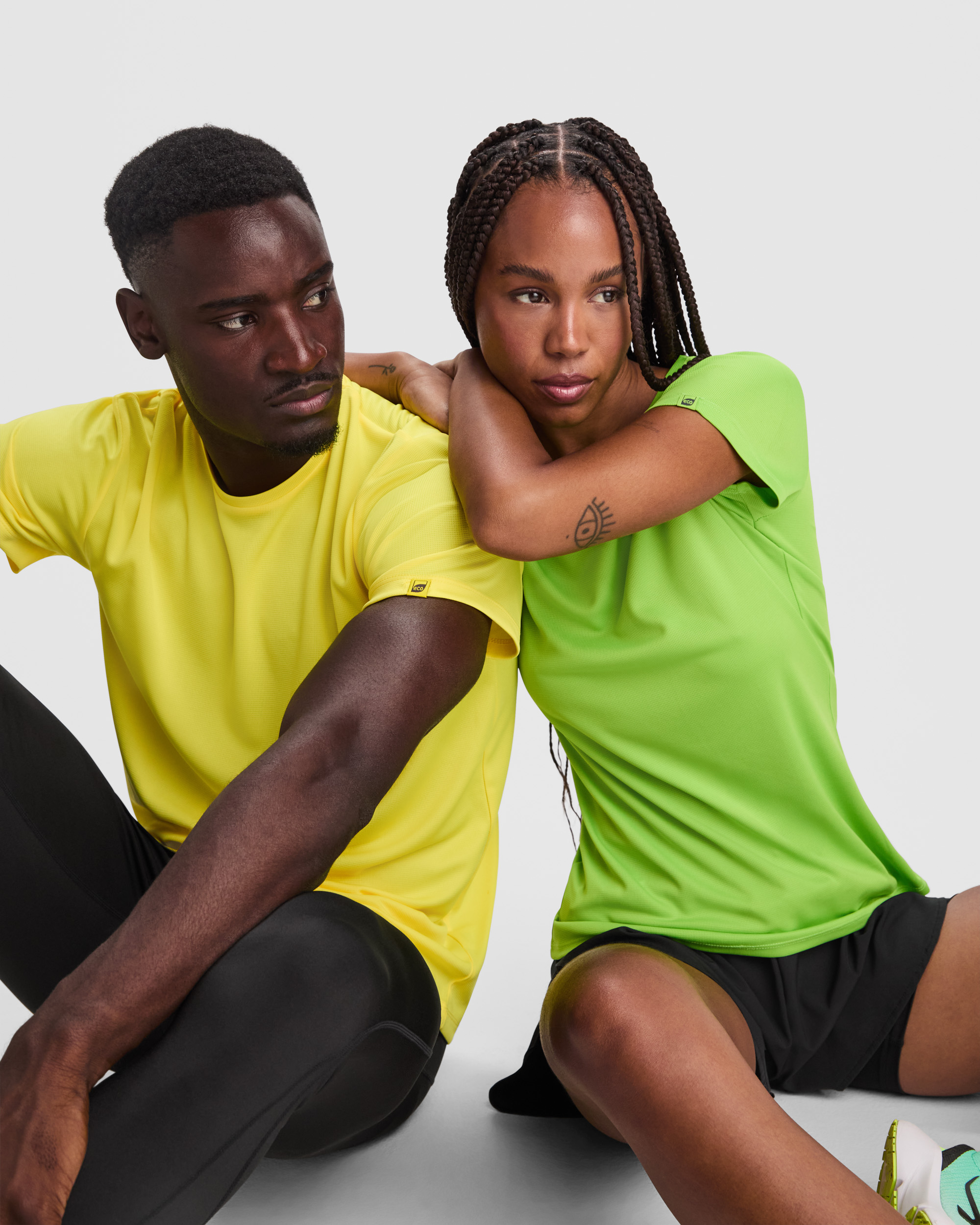 Camiseta técnica manga corta entallada transpirable. Poliéster reciclado. Roly Control Dry. Cuello redondo del y cubrecosturas mismo tejido al tono. Etiqueta tejida ECO. Certificado GRS.