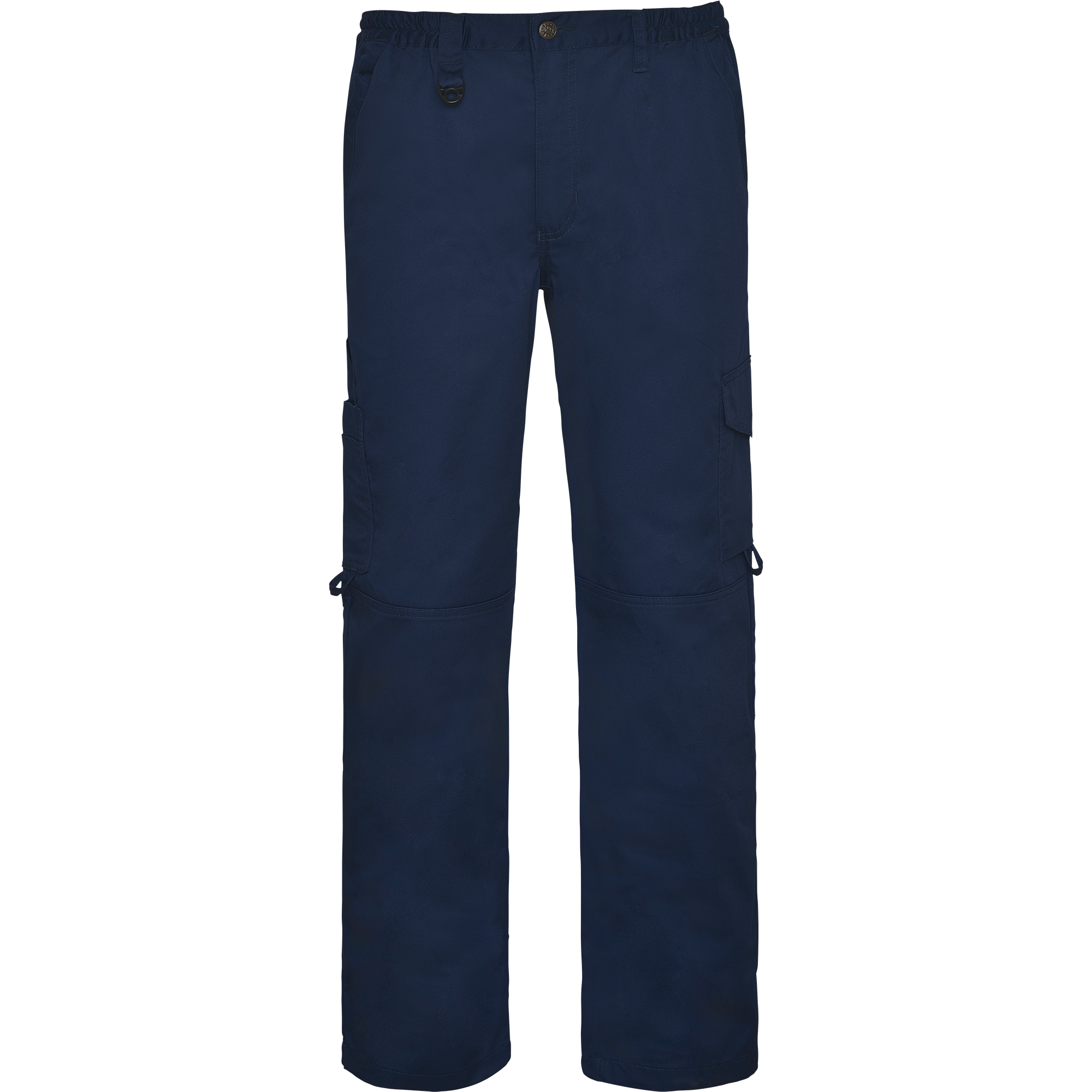 Pantalón largo multibolsillos con botón metálico personalizado.